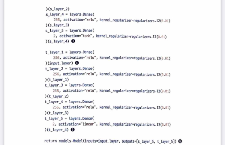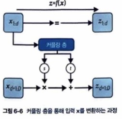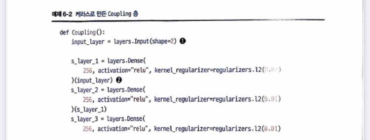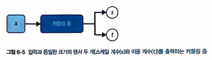 - 커플링 층 : 입력의 각 원소에 대해 스케일 계수와 이동 계수를 만듬. => 입력과 정확히 동일한 크기의 두개의 텐서 만듬.
