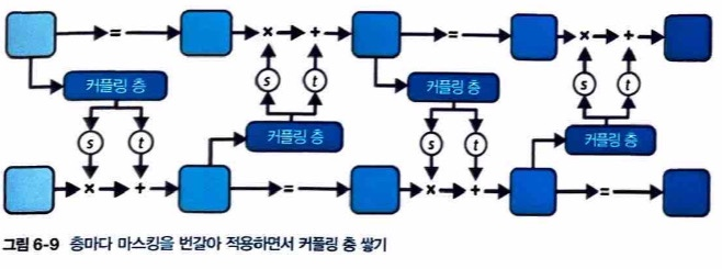 => 커플링 층을 쌓아 마스킹 패턴을 번갈아 적용하면 변경되지 않은 부분을 업데이트해 복잡한 표현 학습.