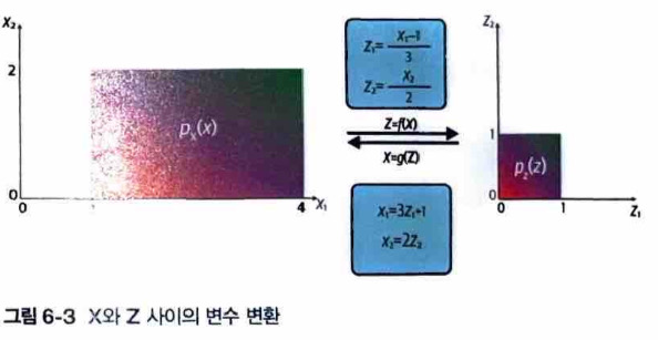 - 면적(고차원에서는 부피)이 1/6로 줄어 적분하면 1/6이 되므로 유효한 확률 분포가 아님.(적분 결과가 1이 되어야 복잡한 확률 분포를 샘플링이 가능한 간단한 분포로 변환 가능.)