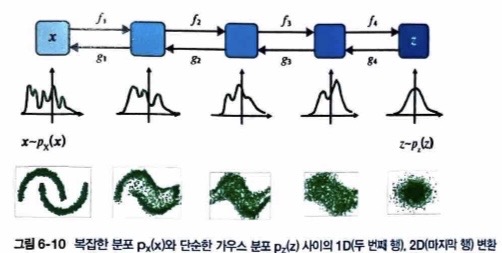 - 데이터 X에서 Z로 매핑할 적절한 가역 함수 f(x)와 샘플링된 z 를 원래 도메인 포인트 x로 매핑하는 역함수 g(z)를 찾기만 하면됨.