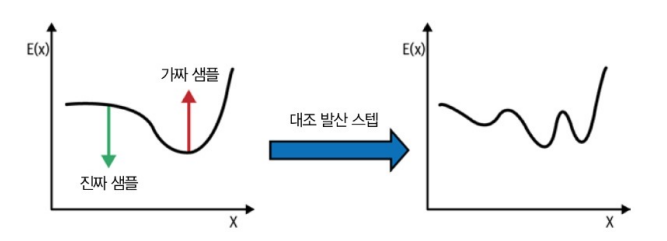 - 대조 발산의 한 스텝에서 실제 샘플 점수는 내려가고 가짜 샘플 점수는 올라감.