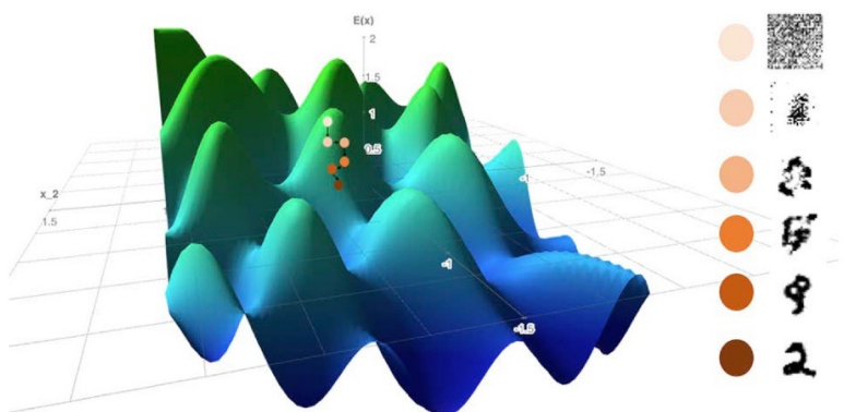 - 에너지 함수는 입력에 대해 하나의 점수만 출력하는데, 이 함수를 사용해 에너지 점수가 낮은 새로운 샘플을 생성하려면? => 랑주뱅 동역학 기법 사용.