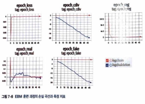 - 실제 샘플에 대해서는 큰 음의 에너지 점수, 생성된 가짜 샘플에 대해서는 큰 양의 에너지 점수 출력. => 두 극단의 차이가 커지게(점수 차이가 손실 함수).