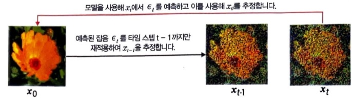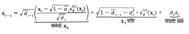 => 모델로 잡음 예측을 사용해 X_0를 추정한 다음 이걸 t-1 타임 스텝까지만 적용해 X_t-1 생성.