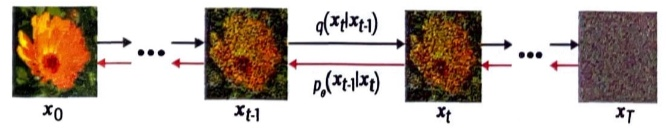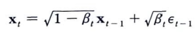 - 이미지 X_t-1에 분산 β_t를 갖는 소량의 가우스 잡음을 추가해 새로운 이미지 X_t 생성하는 함수 q 정의 가능.