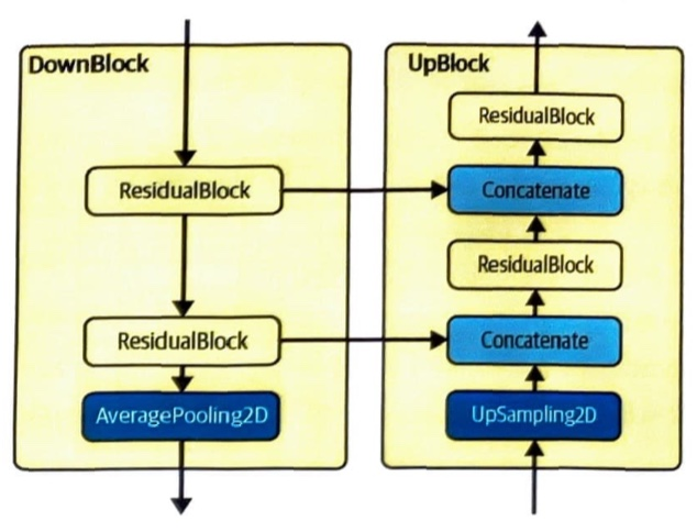 - 연속되는 UpBlock의 갯수(2개) 만큼 ResidualBlock 추가하고 스킵 연결으로 U-Net을 가로지르는 DownBlock의 출력을 이용.