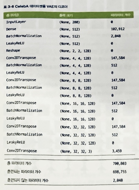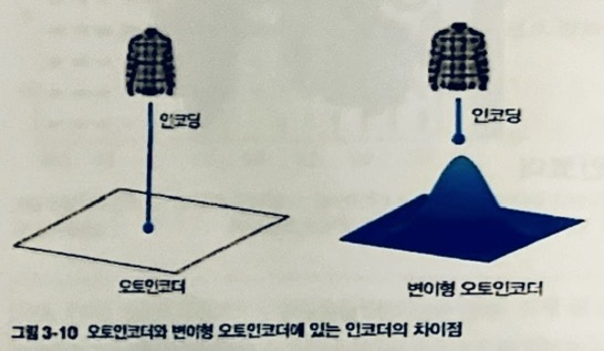 - 오토인코더는 재구성 손실 함수만 있지만 VAE에는 쿨백-라이블러 발산(KL 발산)을 추가로 사용.