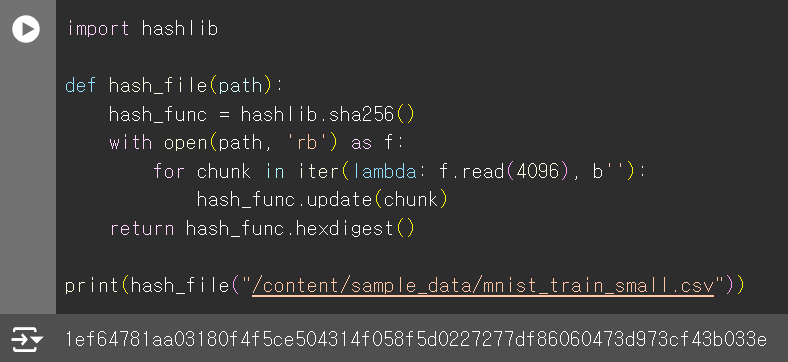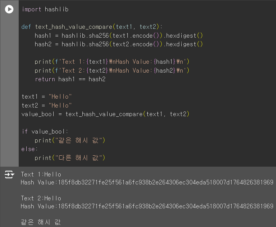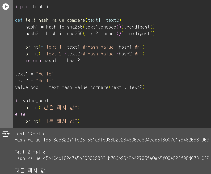 실제로 문자열 데이터에서 해시 값을 살펴 보겠다. 코드는 너무나 쉽다. hashlib 라이브러리를 사용하면 되는데 이게 기본 패키지 인지는 모르겠다. 코랩에서는 기본이다.